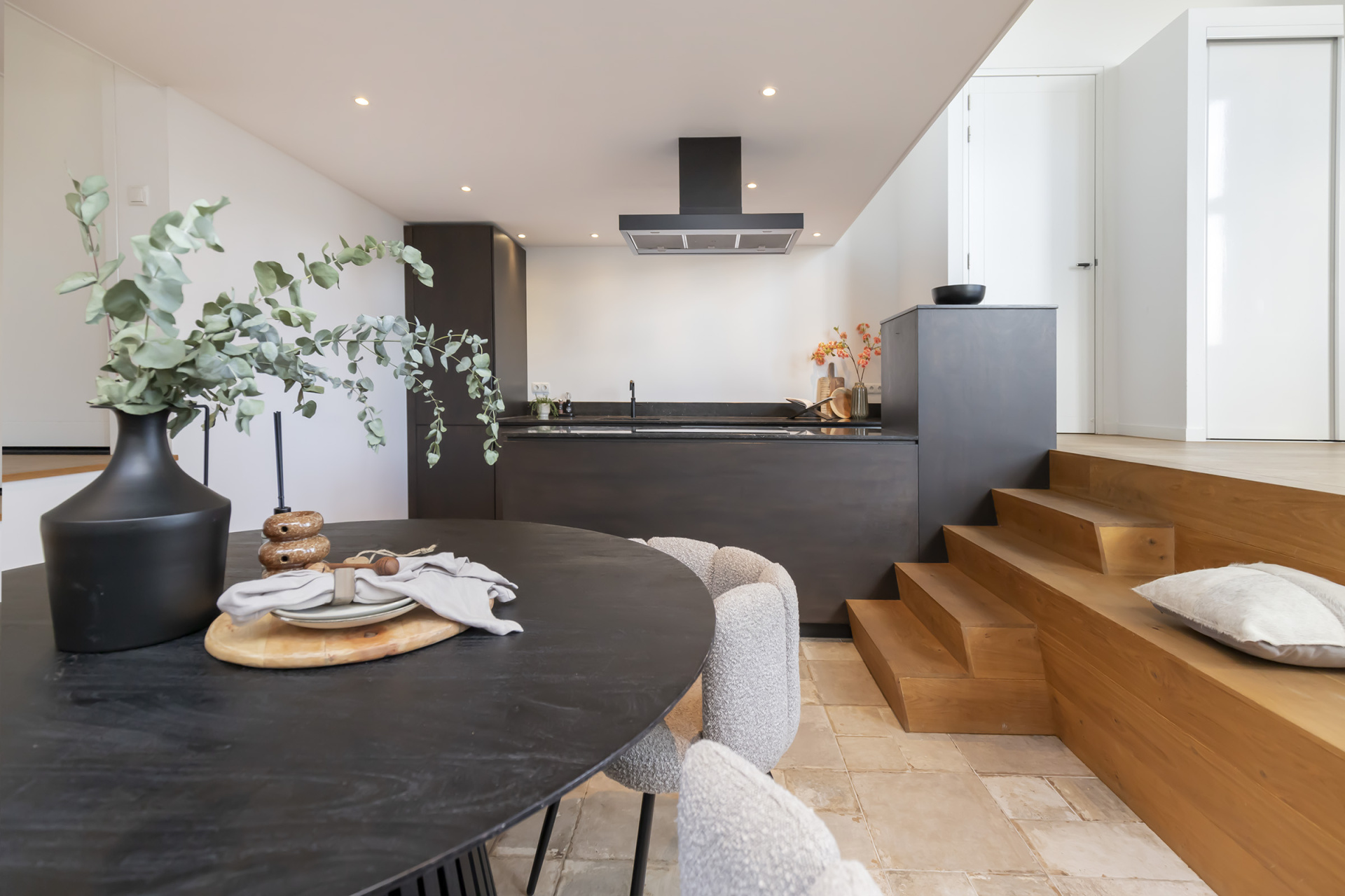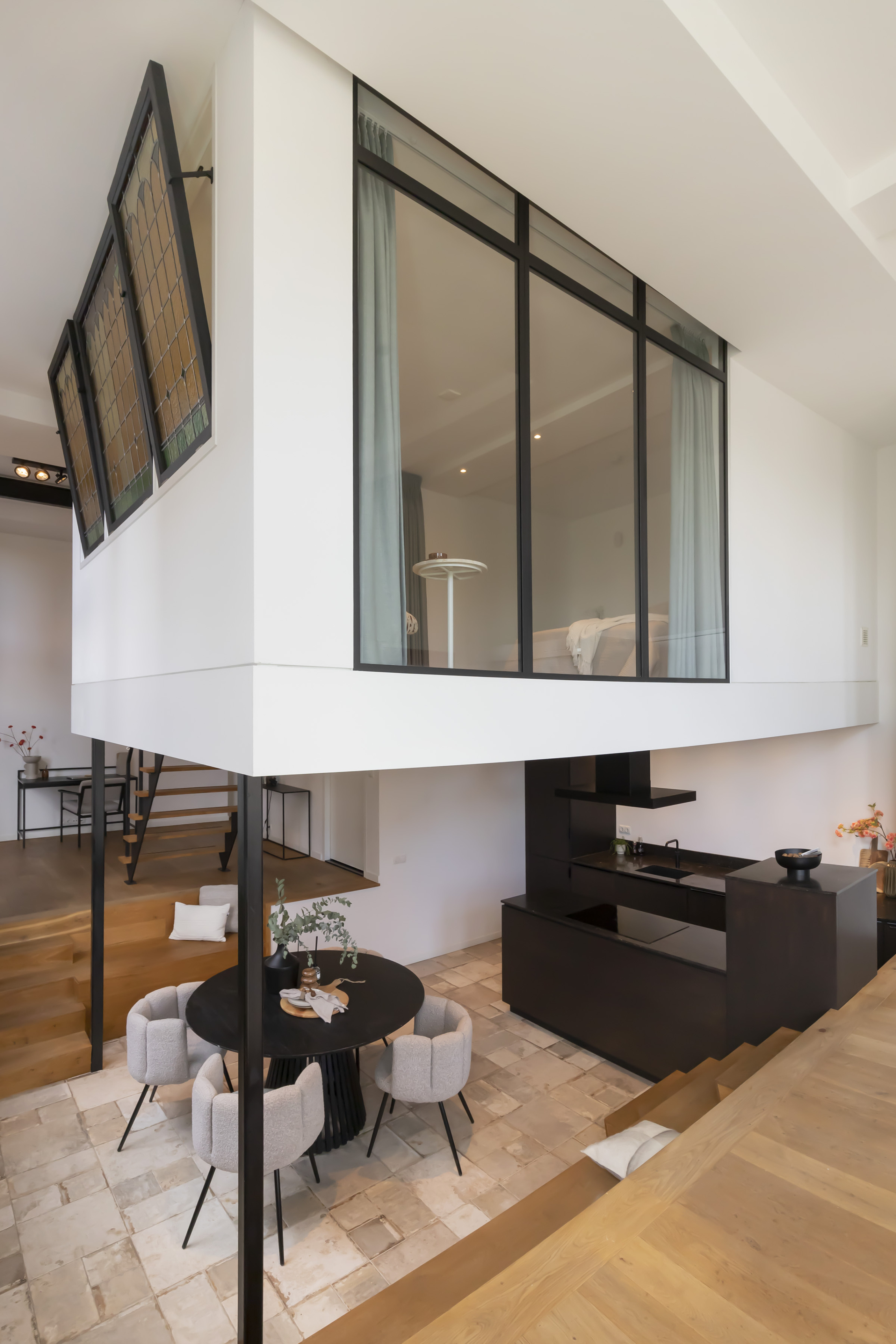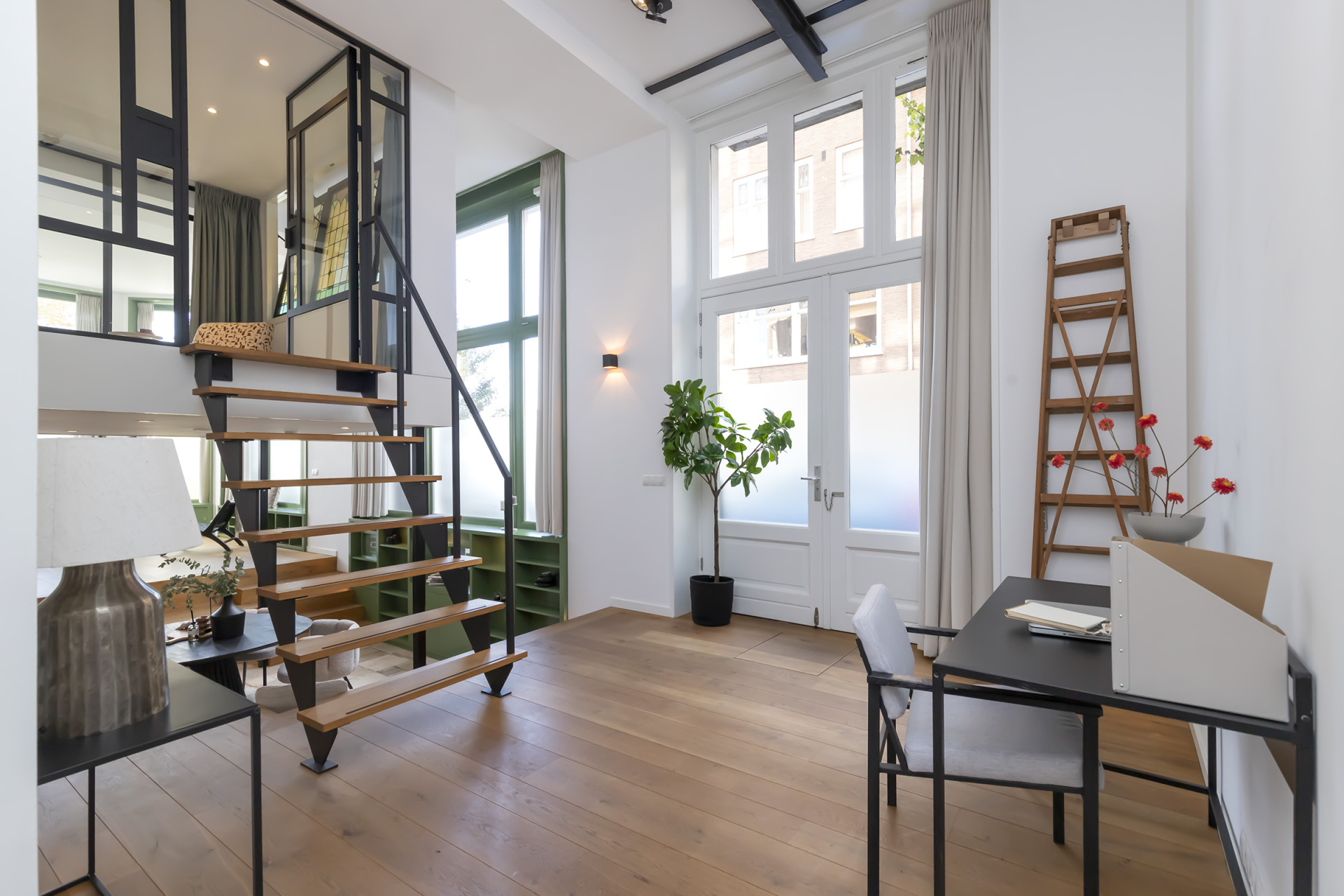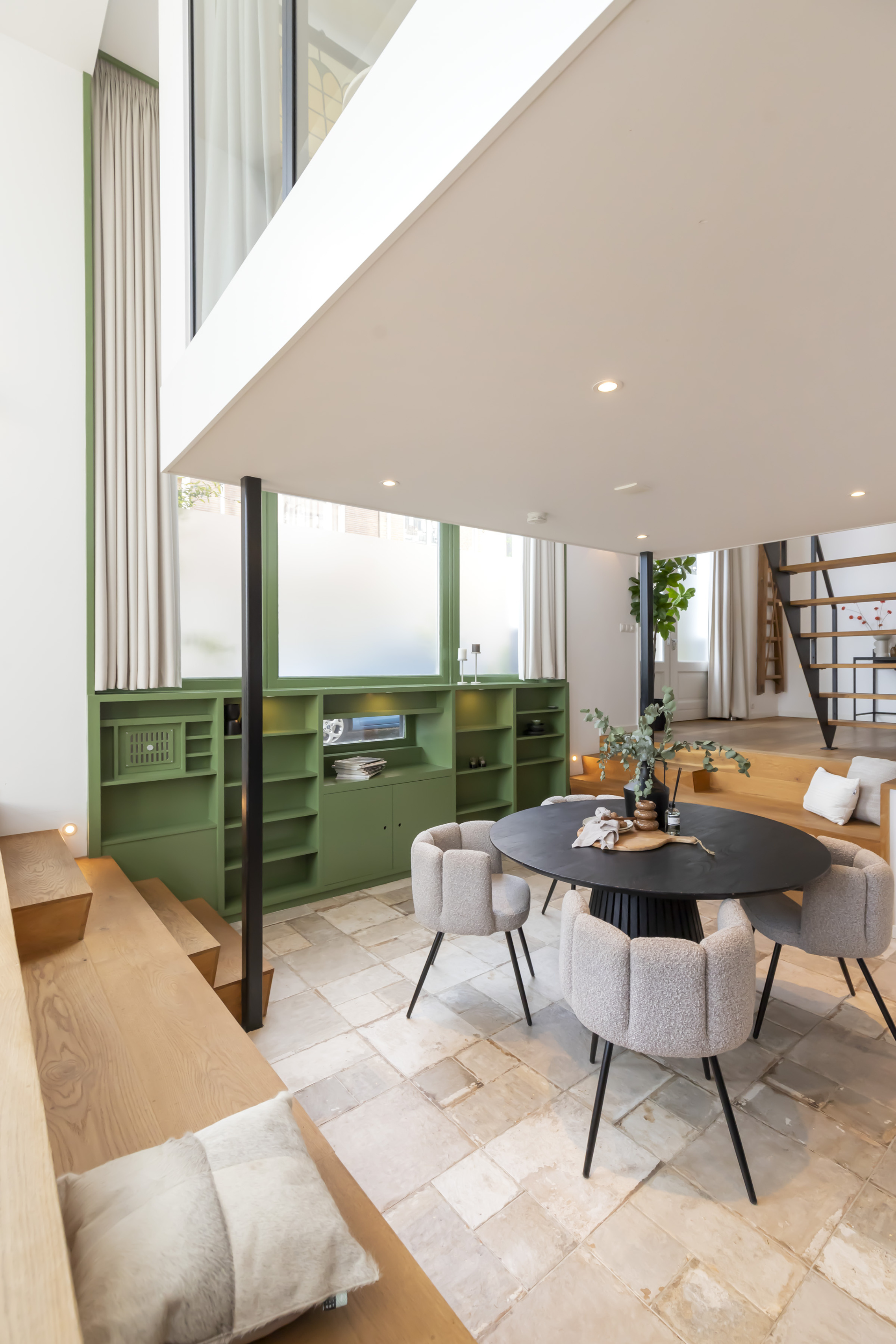 Een woning die zich onderscheidt door zijn speelse indeling, hoge plafonds en industriële details, gecombineerd met een warme en stijlvolle afwerking.