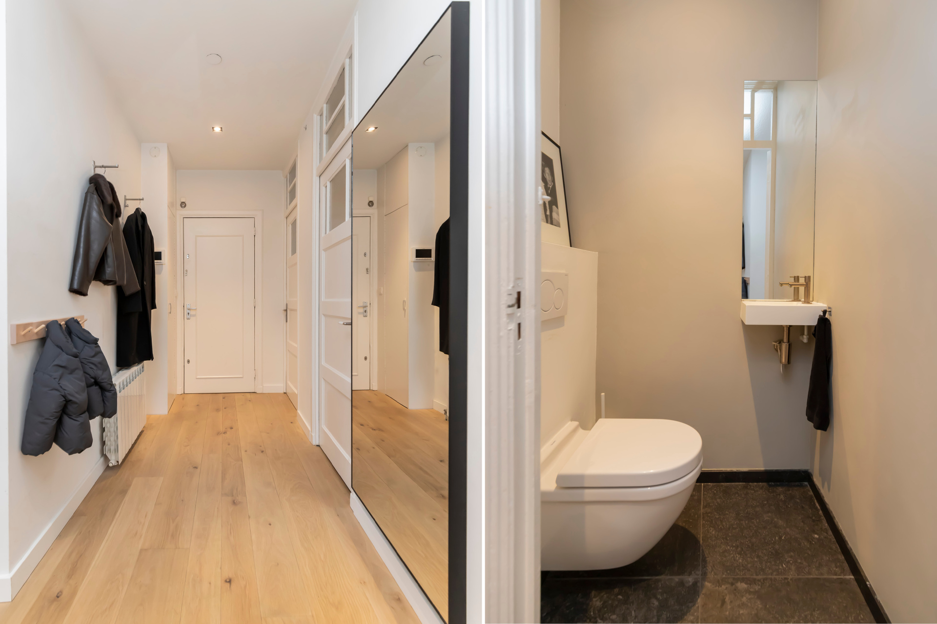 De moderne badkamer en het separate toilet zijn ontworpen door Piet Boon en uitgevoerd met hoogwaardige materialen en designkranen uit de By Cocoon-collectie. De badkamer beschikt over een op maat gemaakt wastafelmeubel, een ruime inloopdouche en een inbouwkast.