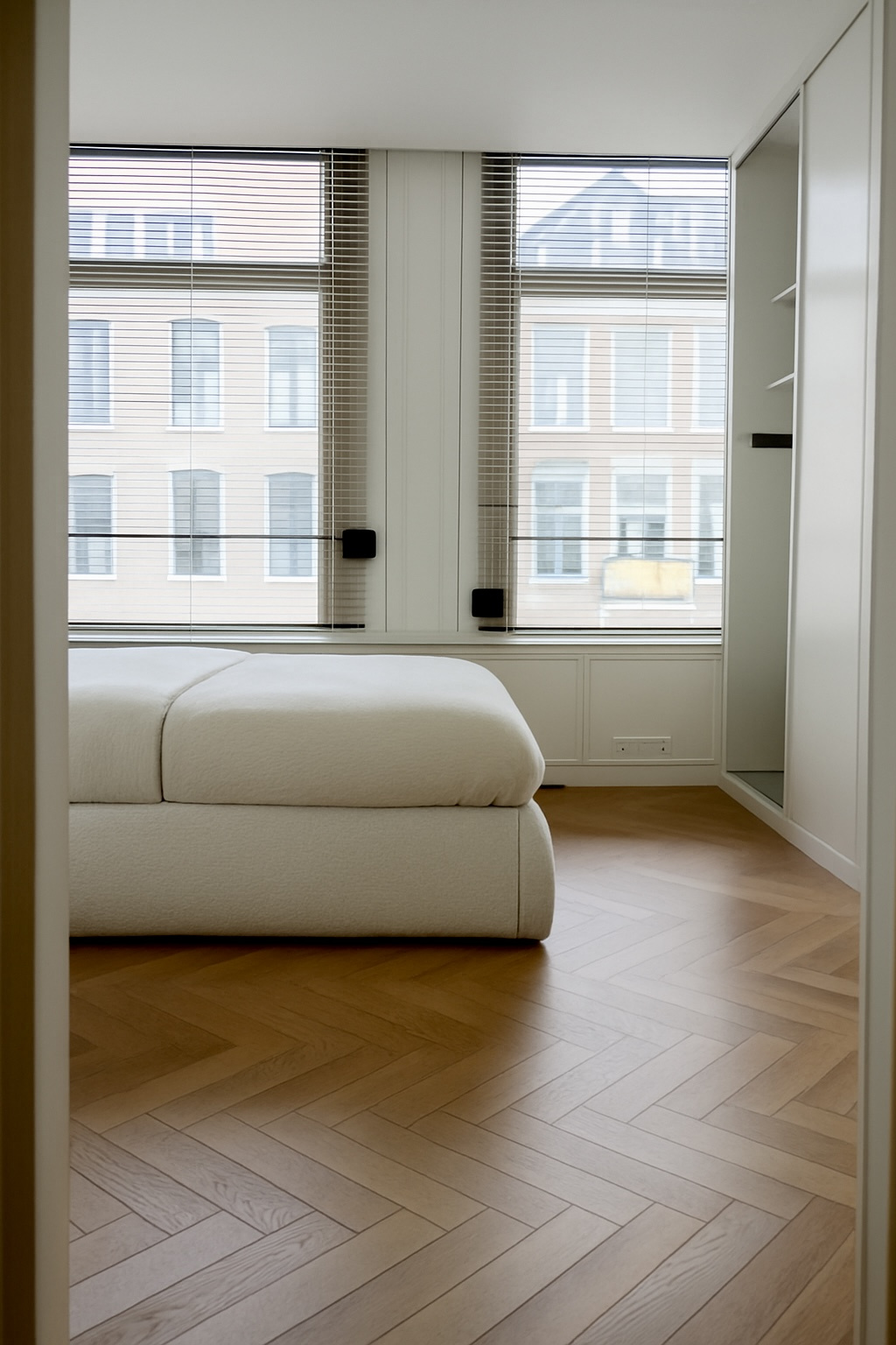 Master-bedroom met rolluiken en op maat gemaakte kledingkast, direct verbonden met de badkamer.