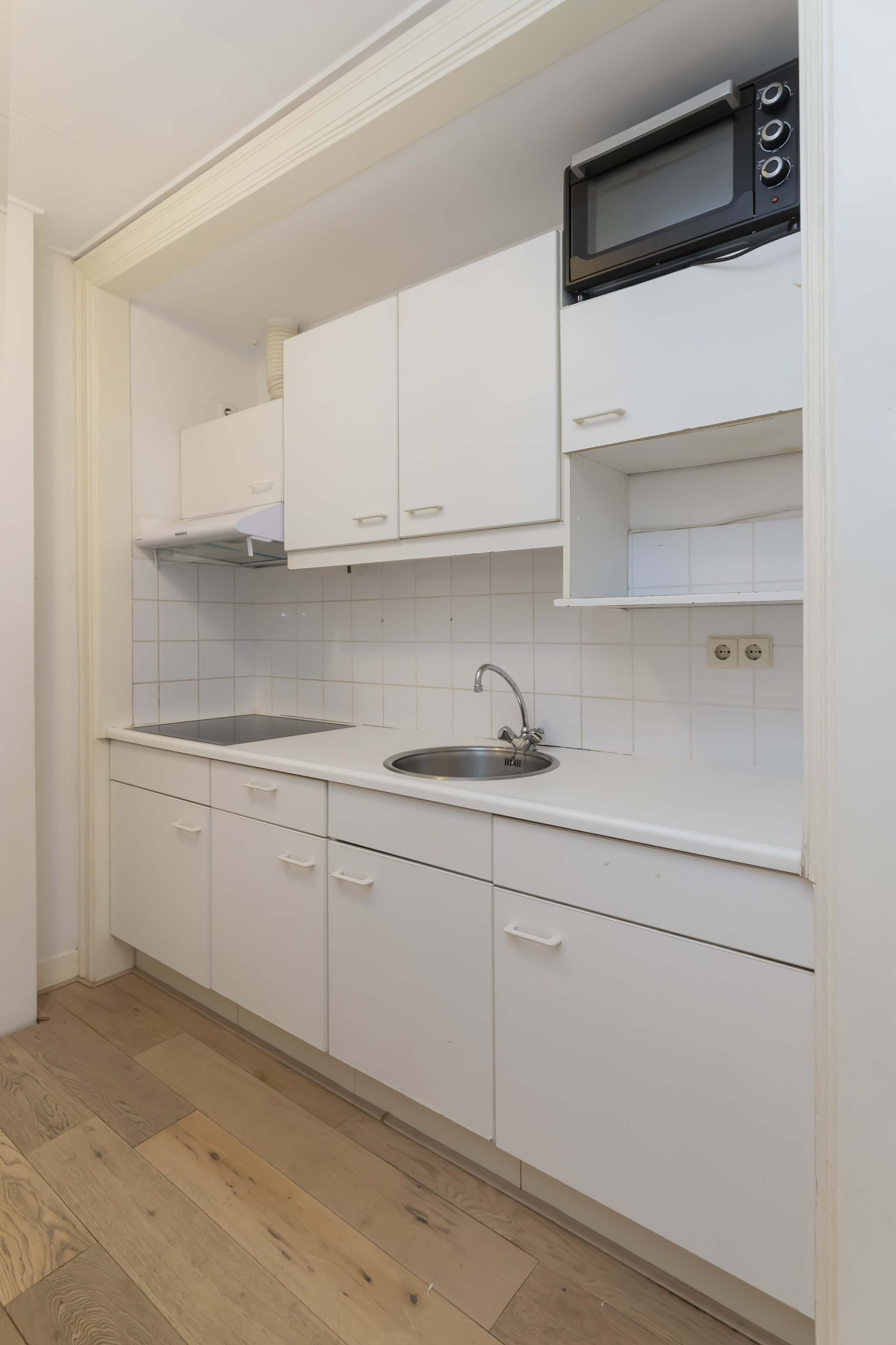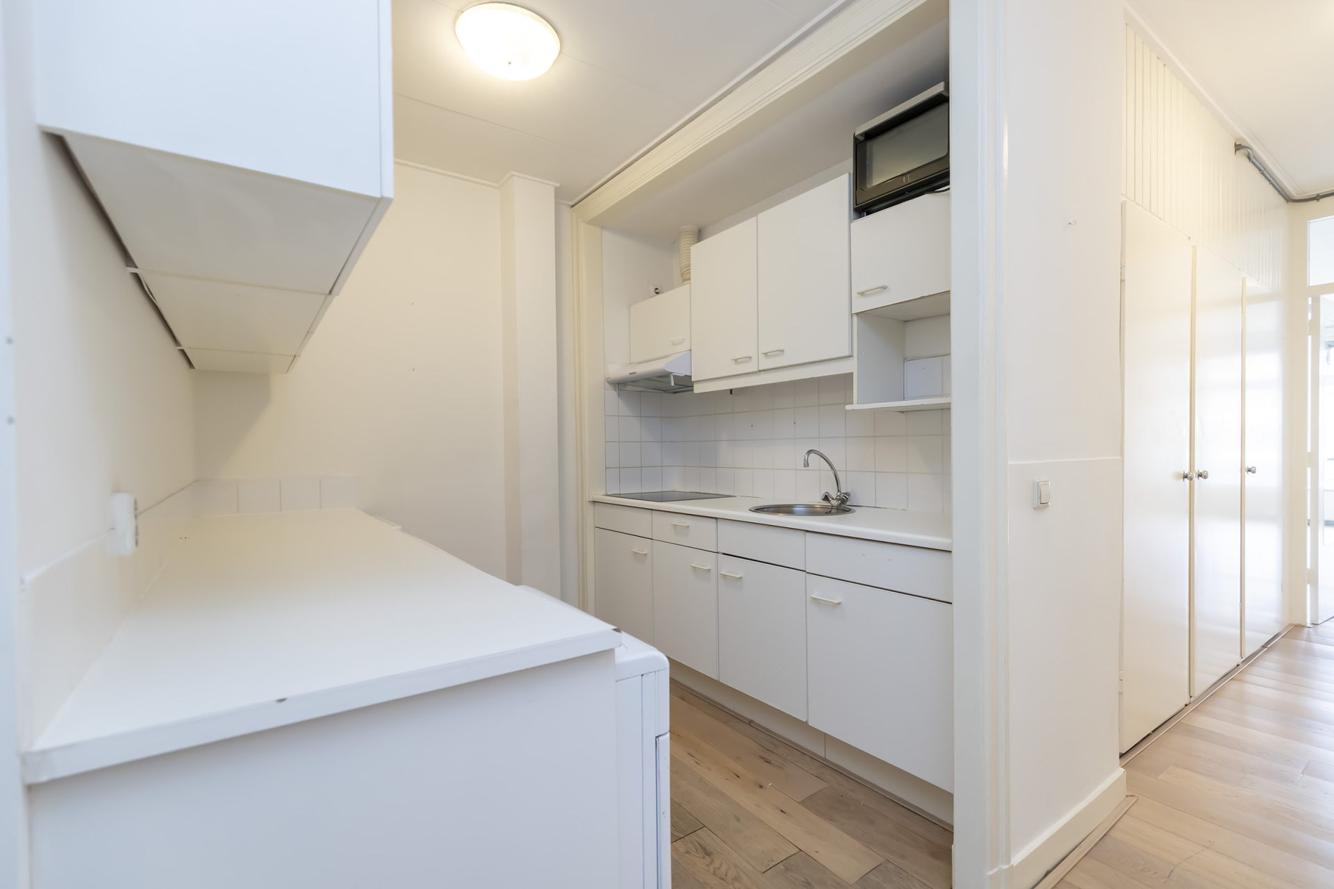 De halfopen keuken ligt centraal in het appartement en biedt volop mogelijkheden om naar eigen smaak te moderniseren. Daarachter ligt de ruime badkamer. Aan de rustige achterzijde bevindt zich een ruime slaapkamer.