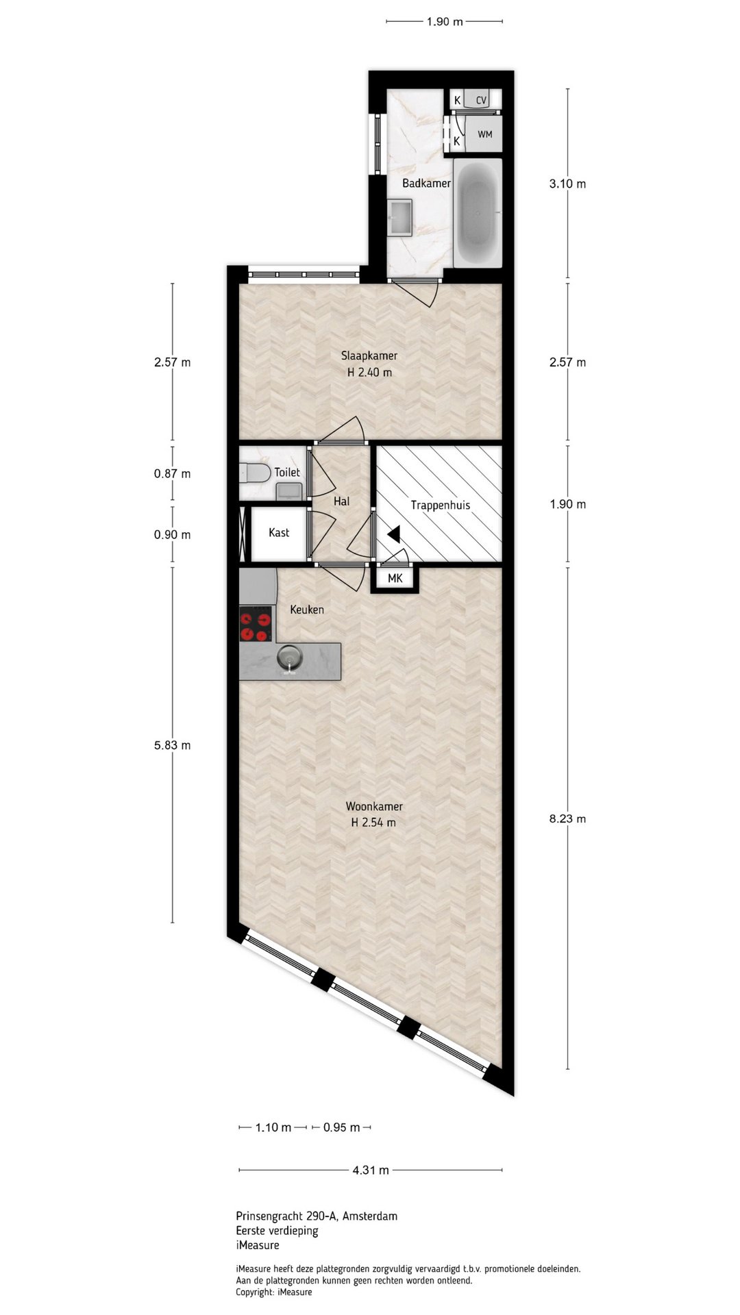 De entree is op de eerste verdieping: entree, hal, met toilet en bergkast. Ruime woonkamer aan de voorzijde met prachtig uitzicht op de gracht richting de Berenstraat. De woonkamer heeft een eenvoudige open keuken. Slaapkamer aan de achterzijde met ruime kastenwand. Vanuit de slaapkamer heb je toegang tot de badkamer. De badkamer is voorzien van een ligbad/douche, een vaste wastafel, een wasmachine aansluiting en tevens is hier de CV ketel geplaatst. Het appartement kenmerkt zich doordat het een zeer licht appartement is en vanwege zijn ligging. Dit is uniek midden in het bruisende leven van de Jordaan.
