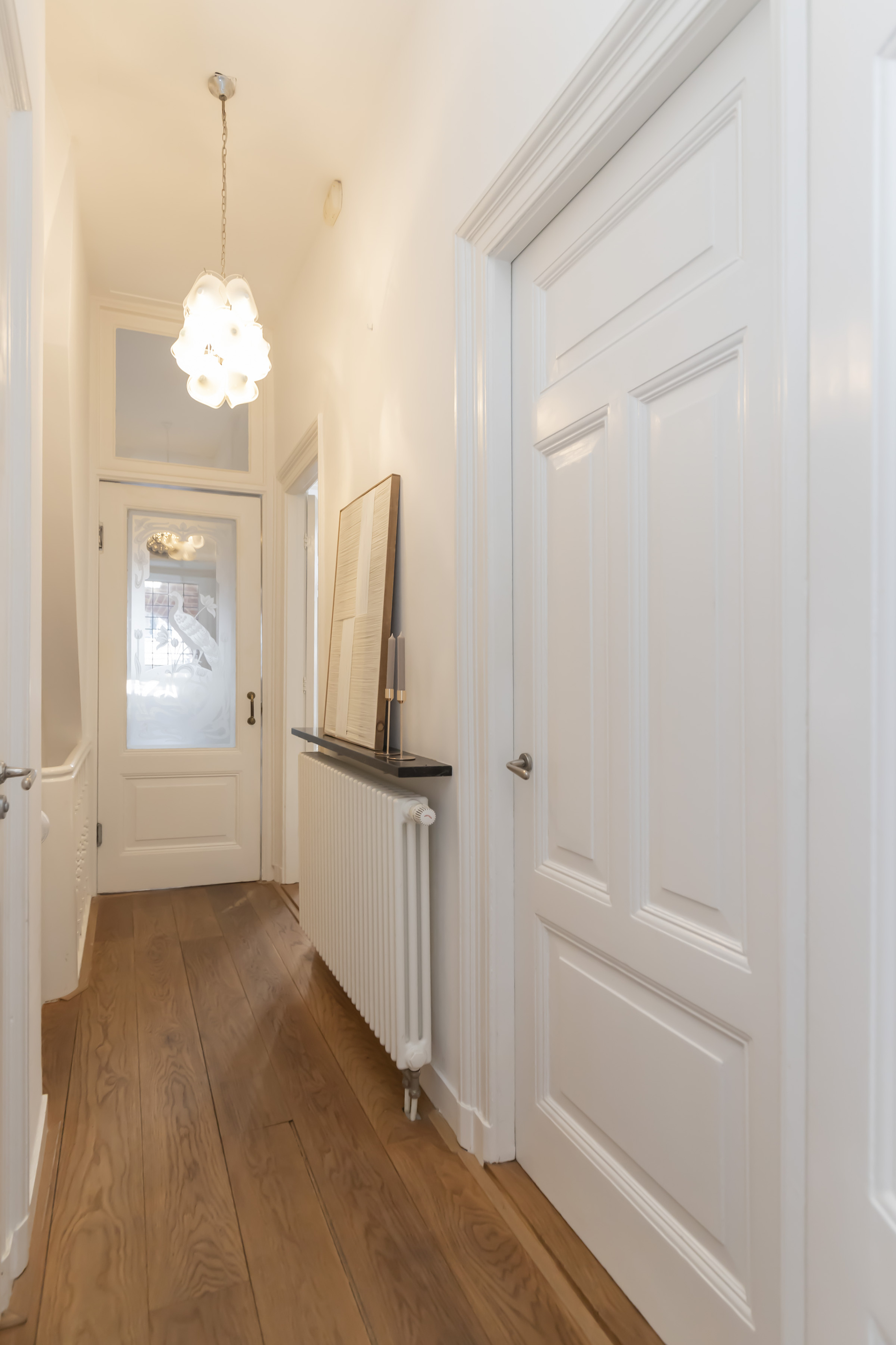 Rijk lijstwerk, paneeldeuren, vaste kasten en een karakteristieke schouw met gashaard geven de ruimte een statige en elegante uitstraling. Aan de voorzijde bevindt zich de zitkamer met grote raampartijen en vrij uitzicht over de straat.