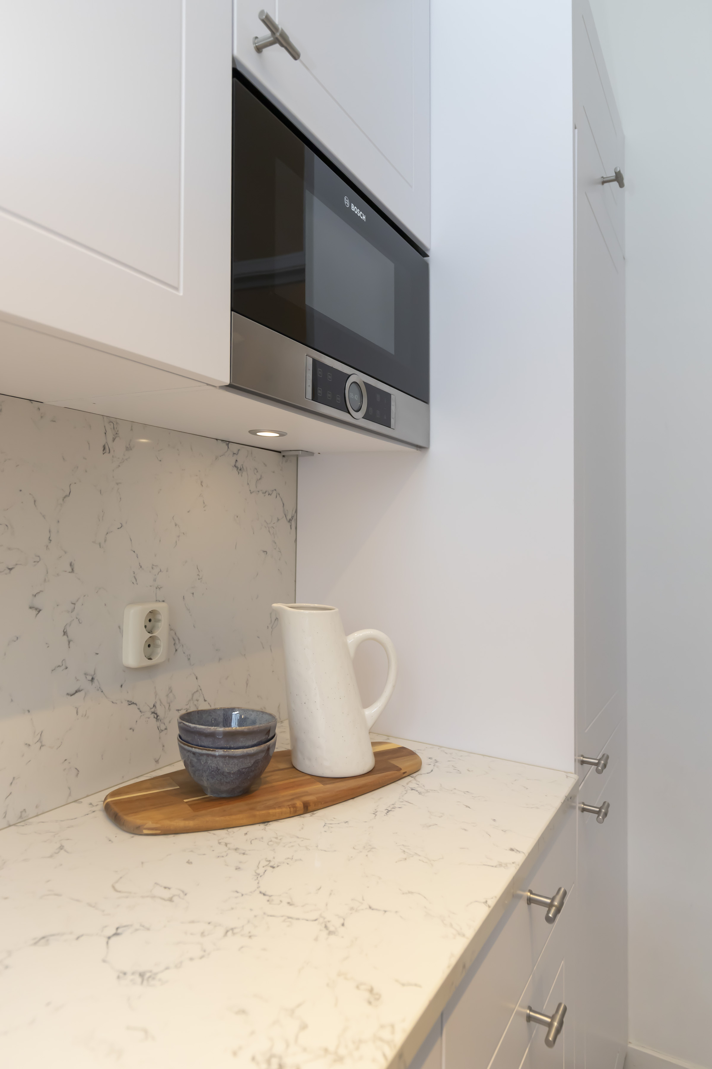 The semi-open kitchen adjoins the dining area and is modern in design, fitted with bespoke cabinetry, an elegant worktop and high-quality appliances.