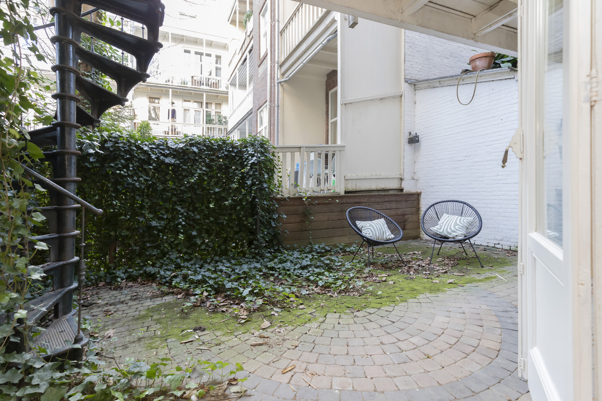 De tuin van ca. 25 m² ligt op het zuiden en biedt een prettige combinatie van zon en privacy. De directe verbinding met zowel het souterrain als met de woonverdieping via de charmante wenteltrap maakt het buitenleven hier bijzonder comfortabel.